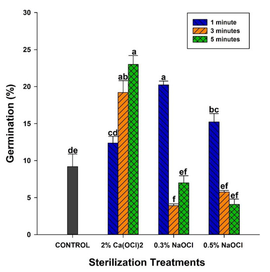 Effects of seed surface sterilization treatments (Control: no sterilization; 2% Ca(OCl)2: 2% calcium hypochlorite; 0.3% and 0.5% NaOCl: Sodium hypochlorite/Ethanol solution for 1, 3, and 5 min on germination of Dracula felix seeds incubated under 12 h Light/12 h Dark at 23 °C for 4 weeks. Histobars with the same letter are not significantly different (α = 0.05).