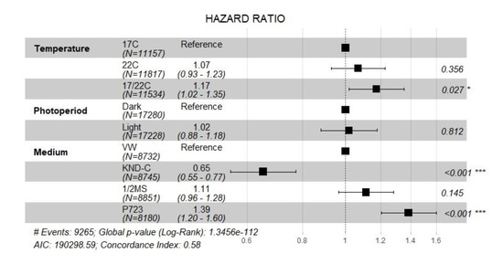 Hazard ratios of the adjusted main effects from a Cox proportional regression model that included two- and three-way interaction effect on seed germination of Dracula. felix.