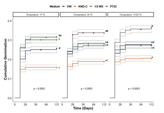 Cumulative proportion of germinated seeds of Dracula felix sown on different asymbiotic medium types and incubated at different temperatures. Curves with the same letters are not significantly different according to a multiple pair wise comparison log-rank test with a Bonferroni correction to adjust p-values at α = 0.05 significance level.