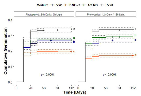 Cumulative proportion of germinated seeds of Dracula felix sown on different asymbiotic medium types and incubated at different photoperiods. Curves with same letters are not significantly different according to a multiple pair wise comparison log-rank test with a Bonferroni correction to adjust p-values at α = 0.05 significance level.
