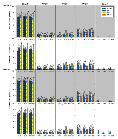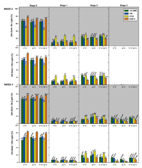 Protocorms with the beginning of leaf primordia (Stage 4, Figure 3e) were observed at week 6 and 8 only on ½ MS and VW with significantly higher percentages under 12 h Light compared with 24 h Dark photoperiod in all temperatures (Figure 8). By week 8, few Stage 4 protocorms developed on P723 at 17/22 °C in plates incubated under complete darkness for 6 weeks at the beginning of the experiment; however, no further developmental stage was supported on P723 under any of the experimental conditions (Figure 8 and Figure 9). Several Stage 4 and 5 protocorms became white and developed into irregular ovoid shapes in all treatments (Figure 3h). Protocorms like bodies were observed on VW plates (Figure 3i).