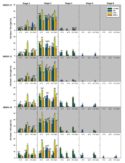 By week 10, seedlings with elongated leaf primordia (Stage 5, 3f) were observed only in plates incubated under a 12 h Light photoperiod, on VW at 17 °C and 17/22 °C. A significantly lower percentage of Stage 5 seedlings were produced also in ½ MS at 22 °C compared with VW at the other temperatures (Figure 9).