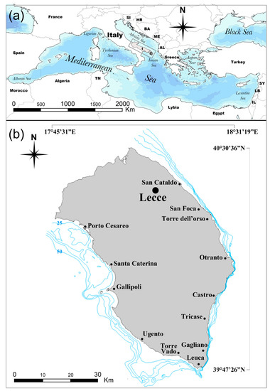 Situated in the southwestern part of the Adriatic Sea, the Salento peninsula is the southern tip of the Apulian region (Italy), located ~75 km from Albania as well as from the Northern Ionian Islands (Greece). The Salento coastline, corresponding with the province of Lecce, extends for ~250 km, from the north of San Cataldo to the east, to the north of Porto Cesareo to the west (Figure 1).