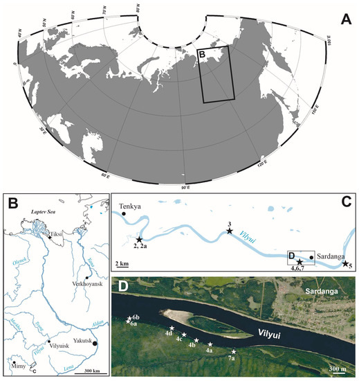 Maps showing the location of studied Lower Jurassic outcrops. (A)—position of the studied region on the map of Eurasia; (B)—map of the region; (C)—detailed map of the studied segment of the Vilyui River; (D)—satellite photo and the position of fossil localities near Sardanga settlement. Stars in (C,D) indicate the positions of the outcrops, numbers refer to their enumeration.