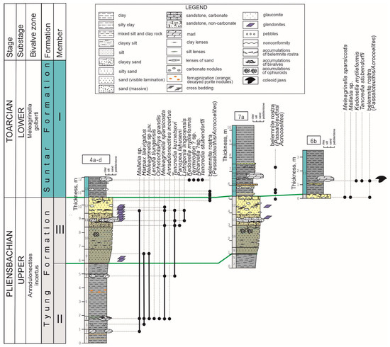 The overlying lower Toarcian Suntar Formation (up to 60 m) is represented chiefly by mudstones (in the lowermost part, mainly thin-laminated clay intercalated with infrequent silty surfaces, or ‘black shales’) with numerous carbonate concretions. The lower 10–20 m of the succession contain rare bivalve findings. Until now, only a single occurrence of ammonite was reported from the lowermost part of the Suntar Formation ([7], figure 3): this specimen, identified as Pliensbachian Paltarpites argutus in the original publication, was later re-identified as Toarcian Harpoceras by M.S. Mesezhnikov (see [16]). Also, the ‘black shale’ strata at the base of the Suntar Fm contain numerous poorly preserved belemnite rostra ([8]; as ‘fourth member’ of the Pliensbachian Tyung Fm). Relatively common ammonites (Dactylioceras of D. commune group, Harpoceras, and Zugodactylites) and very numerous bivalves (mainly Dacryomya, Tancredia, Lenoceramus) and belemnites (Catateuthis, Acrocoelites, ‘Nannobelus,’ Clastoteuthis, Odontobelus) occur in the upper part of the Suntar Formation [16,17,18], with bivalves and belemnites often forming allochthonous accumulations. Besides mollusks, the Pliensbachian–Toarcian beds of the Vilyui River basin are known for their ichthyosaurian and plesiosaurian occurrences [19].