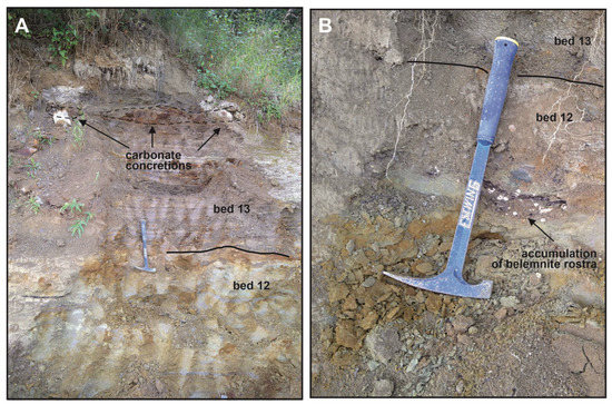 Field photos of the Pliensbachian/Toarcian boundary in the section 4b. (A)—general view on the boundary beds; large carbonate concretions 1.2 m above the boundary are well-visible; (B)—level of the first appearance of belemnites within the succession (topmost part of the Pliensbachian) is visible right from the hammer.