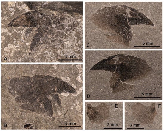 Specimen No. 1 (MAR 3/1; Figure 4A,B) is an upper jaw having a total length of 14 mm and a height of 9 mm (upper total length, UTL, and upper total height, UTH, respectively according to [23], Figure 1). A well-preserved external plate of the jaw (hood) demonstrates a prominent anterior tip (rostrum) and both lateral wings behind it. The inner plate is partly visible along the lower-rear part of the wings, but its rear part is not preserved. The rostrum is robust and pointed, achieving almost 5 mm in length. Its inner margin is relatively straight and the angle between the rostrum and wings (jaw angle) is acute, circa 65°.