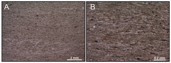 Thin section of the jaw-bearing concretion, showing clearly visible fine lamination. (A)—general view; (B)—details of fine lamination.