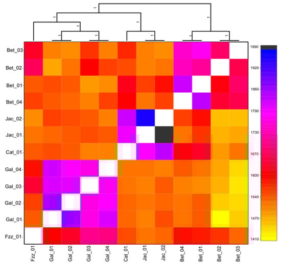 Andrena agilissima displayed a different pattern of genetic structure when compared to the other two species. The three methods used for inferring population structure (i.e., FineRADstructure, ALstructure and PCA) showed clear separation in the three groups (Figure 1, Figure 2, Figures S1 and S4): (i) the West group, comprising the samples from Galicia (Gal); (ii) the Ebro river valley group, that clusters individuals from Catalonia and Jaca (Cat and Jac, respectively); and (iii) the Baetic group, formed of individuals from the Baetic mountains (Bet). Both FineRadStructure and Alstructure (with K = 4) clustered the individuals from Ferreira do Zêzere (Fzz) closer to the West group (Figure 2 and Figure S1). PCA showed less clear separation among the three principal groups (Figure S4). Interestingly, within the Baetic group, we found considerable variation, with individuals Bet_04 and Bet_01 clustered together, and Bet_02 and Bet_03 formed a second sub-cluster within the Baetic group (Figure 2). However, based on the FineRADstructure clustering, we keep it as a single cluster.