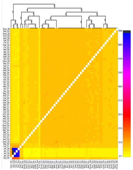 - Winter, D.J. Mmod: An R Library for the Calculation of Population Differentiation Statistics. Mol. Ecol. Resour. 2012, 12, 1158–1160. [Google Scholar] [CrossRef]