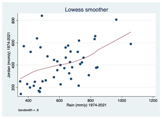 Trend of changes (Lowess Smoother, 0.8 bandwidth). of the regression between annual (1974–2021) mean discharge (mcm/y) of the River Jordan and rainfall capacity (mm/y) measured near the source of the Dan (Dafna);(Linear Regression: r2 = 0.6158; p = 0.0054).