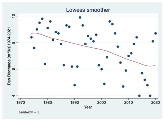 Temporal Trend of Changes (Lowess Smoother, 0.8 bandwidth) of annual (1974–2021) mean discharge (m3/s) of River Dan; (Linear Regression: r2 = 0.2125; p = 0.0011).