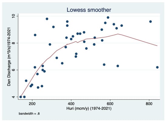 Trend of changes (Lowess Smoother, 0.8 bandwidth) of the regression between annual (1974–2021) mean discharge (m3/s) of River Dan and Jordan River annual discharge (mcm; 106 m3/year); (Linear Regression: r2 = 0.3217; p < 0.0001).
