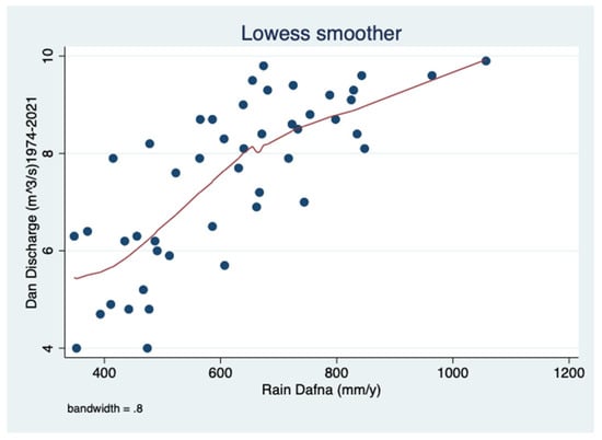 Trend of changes (Lowess Smoother, 0.8 bandwidth) of the regression between annual (1974–2021) mean discharge (m3/s) of river Dan measured near the source of the Dan (Dafna) and rainfall capacity (mm/y). (Linear regression: r2 = 0.5818; p < 0.0001).