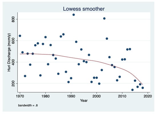 Temporal Trend of changes (Lowess Smoother, 0.8 bandwidth) of River Jordan discharge (mcm/y; 106 m3/year) (Huri Station) during 1970–2018; (Linear Regression: r2 = 0.1512; p = 0.0083).