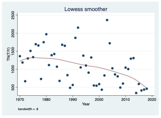Temporal Trend of changes (Lowess Smoother, 0.8 bandwidth) of annual load of Total Nitrogen (TN) (Ton/Year) measured in River Jordan discharge (Huri Station) during 1970–2018; (Linear Regression: r2 = 0.1793; p = 0.0024).