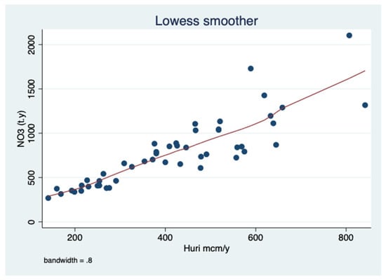 Trend of changes (Lowess Smoother, 0.8 bandwidth) of the regression between annual load of Nitrate (NO3) (Ton/Year) and annual discharge of the River Jordan measured in Huri Station during 1970–2018; (Linear Regression: r2 = 0.7574; p < 0.0001).
