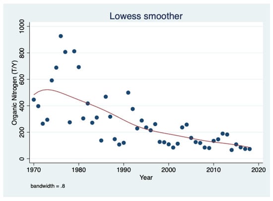 Temporal Trend of changes (Lowess Smoother, 0.8 bandwidth) of annual load of Organic Nitrogen (Ton/Year) measured in the River Jordan (Huri Station) during 1970–2018; (Linear Regression: r2 = 0.4888; p < 0.0001).