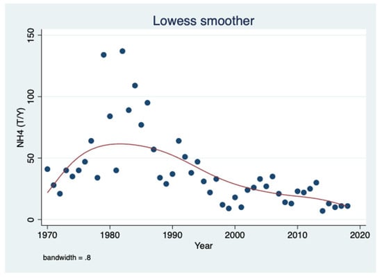 Temporal Trend of changes (Lowess Smoother, 0.8 bandwidth) of annual load of Ammonium (NH4) (Ton/Year) measured in River Jordan discharge (Huri Station) during 1970–2018; (Linear Regression: r2 = 0.2952; p < 0.0001).