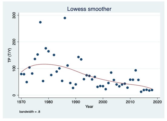 Temporal Trend of changes (Lowess Smoother, 0.8 bandwidth) of annual load of transported Total Phosphorus (TP) (Ton/Year) measured in River Jordan discharge (Huri Station) during 1970–2018; (Linear Regression: r2 = 0.2957; p < 0.0001).