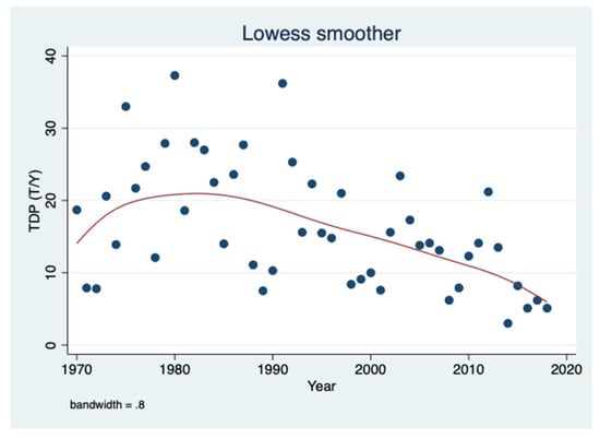 Temporal Trend of changes (Lowess Smoother, 0.8 bandwidth) of annual load (Ton/Year) of Total Dissolved Phosphorus measured in river Jordan discharge (Huri Station) during 1970–2018; (Linear Regression: r2 = 0.2372; p = 0.0004).
