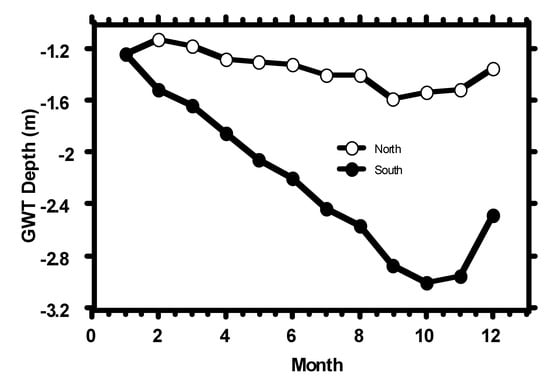 No data are available about Ground Water Table (GWT) seasonal and temporal changes before the drainage. Annual changes in the water level in the old Lake Hula ranged between 1.0–1.5 accompanied by a fluctuating inundation range of the swampy wetlands between 21 km2 in summer and 60 km2 in winter (Dimentman et al., 1992). Significant higher concentrations of nutrients (TDP, PO4, NH4, TDN) in the northern part of the Hula Valley were indicated. It is suggested that the accumulation of nutrients (except nitrates) in the southern part of the underground occurs by horizontal migration of nutrient-rich water from north to south supported by vertical infiltration through the southern mineral soil. The underground water migration through the preferential water pathways probably enhances two types of process: (1) an erosive impact resulting in the significantly higher Particulate—P concentration in the south, and (2) horizontal underground flow from the north which accumulates in the south. The increase in nutrient concentrations is also enhanced by GWT decline in the southern underground (Figure 5) waters and water loss through evapotranspiration in the southern marl soil and vegetation cover of deep-rooted trees (orchards). The amplitude of the seasonal fluctuations of the GWT in the south is greater than in the north (Figure 12 and Figure 13).