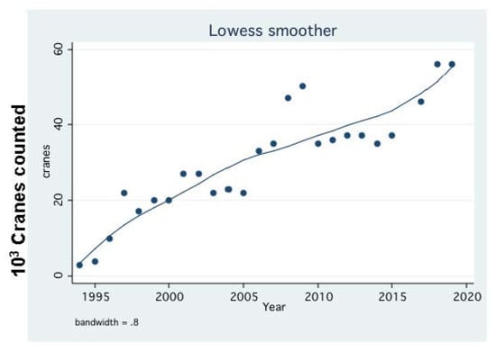 Temporal (1994–2018) changes of maximal counts of the wintering crane population in the Hula Valley (LOWESS Smoother, Bandwidth 0.8).