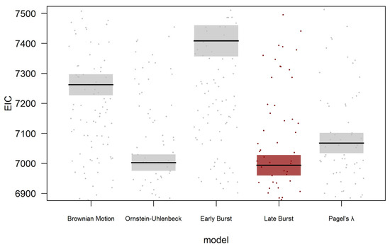 Bootstrapped extended information criterion (EIC) values for the five evolutionary models used to account for the phylogenetic dependences between protein electrophoretic profiles and sexual dimorphism in the phylogenetic generalized least squares model. Solid lines = mean value; shadowed rectangles = ±1 SE interval around the mean; grey points = observed bootstrapped value for each model (100 in total). The best model (lowest EIC) is dark-red colored.