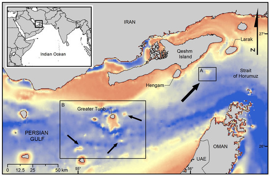 Bathymetric map of the eastern Persian Gulf. Brown = shallow; blue = deep. (A) The location of the submerged bank; (B) other submerged banks with potential high diversity around Greater Tunb Island indicated by arrows.