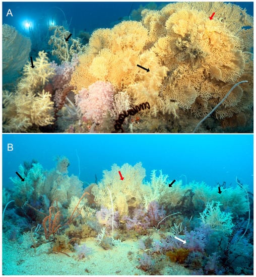 (A) High-density coverage of the habitat on a macro- and microscale (depth of 30–40 m), with the substrate mainly covered by octocorals and antipatharians. (B) Nephtheids (red arrow), Astrogorgia (black arrow), antipatharians, etc.; the solitary scleractinian corals are two Balanophyllia sp. (orange) and one Paracyathus rotundatus (black center). (Photos: A. J. Abdipour).