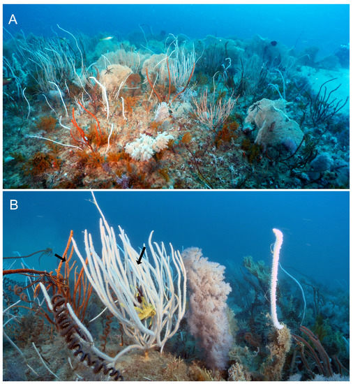 (A) Wide-angle view of the habitat (depth of 30–40 m), mainly covered by octocorals and antipatharians. (B) Ellisella colonies (black arrows). (Photos: A. J. Abdipour.).