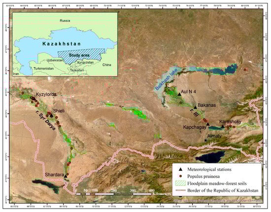 The studies were carried out in the Ili River Valley and adjacent territories, and in the Syr Darya River Valley, Kazakhstan (Figure 1). In the valley of the Ili River, the right bank of the middle course is part of the Ili depression, while the left bank belongs to the foothill inclined plain of the Dzungarian Alatau mountain range. The right bank of the river has a well-developed upper terrace, lying 500–600 m above sea level. The above-floodplain terrace is less developed, and it lies at an altitude of 450–500 m. The floodplain terrace does not have a continuous distribution; it is represented by separate sections lying at different heights. The floodplain and above-floodplain terraces were formed by ancient alluvial deposits, and they have a layered composition. According to the soil texture, they are represented by clays, loams, sandy loams, and sands. The foothill plain adjacent to the river valley lies at an altitude of 650–1000 m a.s.l. It is composed of pebbly gravelly sandy and sandy loamy formations of proluvial–deluvial origin and is characterized by signs of water erosion. The weakly mineralized ground waters of the lower side of the plain lie at a depth of 5–10 m. In certain places, they wedge out onto the daytime surface in the form of springs [,].
