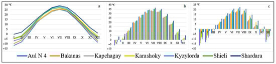 The average monthly minimum air temperature also varied in winter from −1.7 to −16.7 °C, in spring from −4.4 to +16.2 °C, in summer from +14.8 to +22.8 °C, and in autumn from −5.8 to +14.7 °C. The average annual air temperature ranged from +8.3 to +14.6 °C. All the maximum warm values were marked at stations located along the Syr Darya River, and the cold values were marked along the Ili River. The average monthly precipitation ranged from 1 mm in August at Shardara to 39 mm in May at Kapchagay (Figure 3).