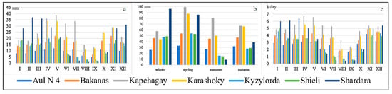 The seasonal fluctuations at the stations were as follows. In winter, it fluctuated from 8–10 mm (Aul N 4) to 28–37 mm (Shardara); in spring from 10–12 mm (Aul N 4) to 21–36 mm (Shardara) and 24–39 mm (Kapchagay); in summer from 1–6 mm (Shardara) to 15–32 mm (Kapchagay); and in autumn from 2–28 mm (Shardara) to 13–29 mm (Kapchagay). The average annual number of days with precipitation ≥ 1 mm ranged from 32 at Shieli and Aul N 4 up to 60 days for Kapchagay. The average monthly number of days with precipitation ≥ 1 mm ranged from 0.5 in July and September at Shardara and Shieli, to 6.7 in April at Kapchagay.