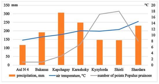 The average annual precipitation ranged from 117 to 306 mm, with the highest precipitation rates occurring in November and spring, and the minimum occurring from June to October at all the stations. The largest number of places with a distribution of P. pruinosa was noted at the weather stations located in Kyzylorda and Shieli, with average annual temperatures of +11.3–11.9 °C, average monthly maximum air temperatures for the year of +17.8–19.1 °C, and minimum temperatures of +5.3–5.4 °C, where the average annual precipitation ranged from 145 to 147 mm (Figure 4).