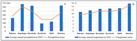 In conjunction with the use of satellite images from 2022 when calculating the distance to watercourses and the normalized difference vegetation index (NDVI), we considered it necessary to analyze the climatic conditions of this year. The analysis of the climatic conditions in 2022 showed that, in terms of temperature, the norm was exceeded by 7–17%. In terms of precipitation, the norm was exceeded by 10–39% at the Shardara, Kapchagay, and Karashoky stations, while at the rest of the stations, the values were 14–39% lower than the norm (Figure 5).
