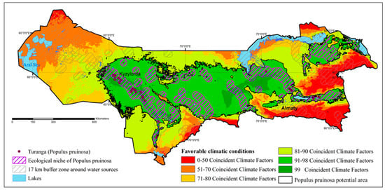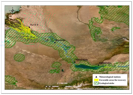 Ecological niche modeling of P. pruinosa was undertaken to identify the relationships between the distribution of the species and the habitat [,] in order to create maps of the potential area and the most suitable places for the restoration of floodplain forests in Kazakhstan. The basis for the mapping were the identified optimal ranges of the key environmental variables [].