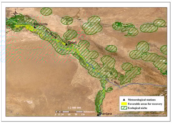 The final stage of these studies was to determine the most favorable areas for the restoration of turanga groves. For this task, we considered it necessary to expand a larger scale. When performing the calculations based on the ecological niche of the species, we used two limiting factors: the most favorable distance to watercourses and the type of soil. Thus, the area for ecological restoration was determined (Figure 7 and Figure 8).