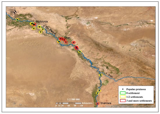 A total of six turanga groves spread along the Ili River are under state protection: five points in the territory of the Altyn–Emel National Park and one grove in the territory of the Balkhash State nature sanctuary. The calculation of the distance of turanga forests to settlements showed that some were located within a five-kilometer zone of several villages, which indicated a high risk of extinction for these groves. Thus, the territories where this species is threatened with extinction have been identified. These sites, concentrated along the Syr Darya River, do not have a conservation status, but they are in need of protection.