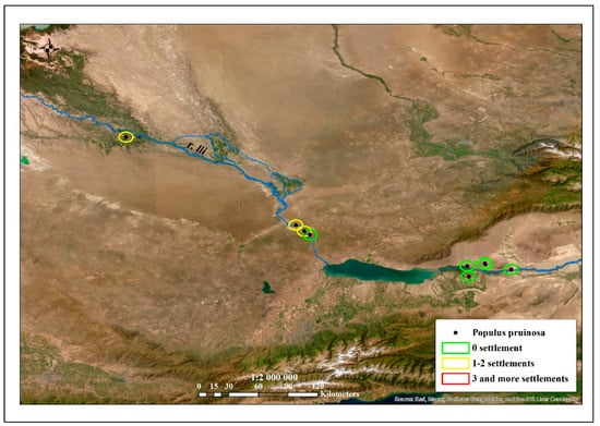 - Ivashchenko, A.A.; Stikhareva, T.N.; Serafimovich, M.V. Assessment of the population status as a basis for monitoring Populus pruinosa in the south-east of Kazakhstan. In Forest Science of Kazakhstan: Achievements, Problems and Prospects of Development, Proceedings of the International Scientific and Practical Conference, Shchuchinsk, Kazakhstan, 13–14 October 2017; Publishing House “The World of Printing”: Kokshetau, Kazakhstan, 2017; pp. 145–147. (In Russian) [Google Scholar]