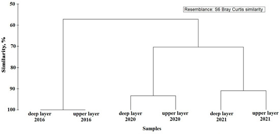 One-way ANOVA analysis, which allows the determination of statistically significant differences between structures of zooplankton in different years of study, detected significant differences in the abundance of cladocerans, copepods, copepod biomass, and Shannon–Wiener diversity Index. The abundance and biomass of crustaceans (cladocerans and copepods) decreased in 2021 compared to 2008, 2016, and 2020 data. Alterations in the structure of the community may be associated with fluctuations in environmental parameters (primarily salinity, temperature) and competition for food and with the presence and impact of predators [