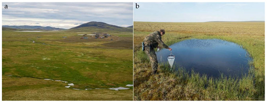 Natural landscape of investigated waterbodies in the Lena Delta Nature Reserve and the adjacent area. (a) Arctic tundra with small waterbodies; (b) phytoplankton sampling.