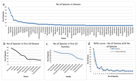 Distribution of diatom species over 123 genera (a), ten richest genera (b), ten richest families (c), and Willis’s curve (d) in the Lena Delta Nature Reserve and the adjacent area.
