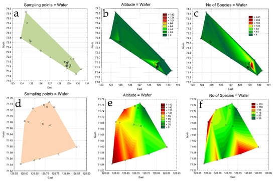 Figure 4 makes it possible to compare the distribution of the studied lakes in the “delta region” and a group of 14 lakes in the “Tiksi region”. Both studied areas have a significant number of the investigated lakes evenly distributed over the territory, the altitude of which is within 0–140 m above sea level and the number of species in individual lakes varies in a wider range on the territory of the reserve than on the territory of Tiksi. That is, environmental properties are similar, and differences are observed in the number of species in lakes. In this regard, it should be noted that the lakes in the delta were visited repeatedly over several years, while 14 lakes in the “Tiksi region” were examined only once.