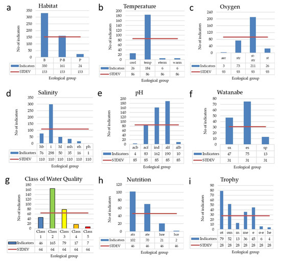 Distribution of species indicators of the waterbodies in the entire Lena Delta Nature Reserve and the adjacent areas over ecological groups. The ecological groups order on the axis x follows the increase in the related environmental indicator. (a) Habitat (P—planktonic, P-B—plankto-benthic, B—benthic). (b) Temperature preferences (cool—cool-water, temp—temperate, eterm—eurythermic, warm—warm-water). (c) Oxygen and streaming (st—standing water, str—streaming water, st-str—low streaming water, aer—aerophiles). (d) Salinity ecological groups according to Hustedt (1938–1939) [62] (hb—oligohalobes-halophobes, i—oligohalobes-indifferent, hl—halophiles; mh—mesohalobes, eh—euhalobes, ph—polyhalobes). (e) pH preferences groups (pH) according to Hustedt (1957) [63] (alb—alkalibiontes; alf—alkaliphiles, ind—indifferent; acf—acidophiles; acb—acidobiontes). (f) Organic pollution indicators according to Watanabe et al. (1986) [64]: sx—saproxenes; es—eurysaprobes; sp—saprophiles. (g) Class 1–5 of organic pollution indicators according to species-specific Index saprobity of Sládeček, 1986 [65]. (h) Nutrition type as nitrogen uptake metabolism (Van Dam et al., 1994) [66]: ats—nitrogen-autotrophic taxa, tolerating very small concentrations of organically bound nitrogen; ate—nitrogen-autotrophic taxa, tolerating elevated concentrations of organically bound nitrogen; hne—facultative nitrogen-heterotrophic taxa, needing periodically elevated concentrations of organically bound nitrogen; hce—obligate nitrogen-heterotrophic taxa, needing continuously elevated concentrations of organically bound nitrogen. (i) Trophic state indicators (Van Dam et al., 1994) [66]: (ot—oligotraphentic; om—oligomesotraphentic; m—mesotraphentic; me—mesoeutraphentic; e—eutraphentic; he—hypereutraphentic; o-e—oligo- to eutraphentic (hypereutraphentic)).