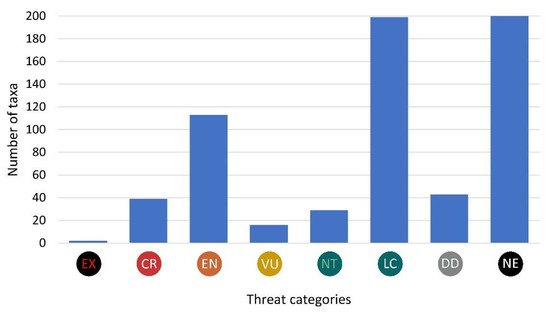 Distribution of the number of diatom species in the flora of water bodies of the Lena Delta Nature Reserve and adjacent territories by IUCN Threat Categories. The order of the IUCN categories on the x-axis corresponds to threat reduction.