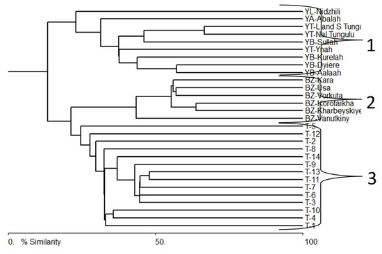 We can see the sufficient role of climatic, morphometric, and other environmental variables in the high latitude lakes community composition because of this calculation. Therefore, we decided to compare diatom community composition in morphometrically similar lakes which were located at the north of Eurasia. Altogether 40 lakes, including 14 Tiksi lakes, were taken for similarity of diatom community calculation: 9 Yakutia lakes (Y) Aalaah, Kurelah, Sullah, Dyiere, Ynah, Nal Tungulu, Large and Small Tungulu, Abalah, Nidzhili [10]; Bolshezemelskaya Tundra lakes (BZ) Vanutkiny, Kharbeyskiye, Korotaikha, Vorkuta, Usa, Kara [2]; Tiksi (T), species from the “Tiksi region” 14 lakes [18] (Appendix A Table A1). The Bray–Curtis calculation of the diatom species composition similarity of the lakes above the Arctic circle latitude of Russia shows strong separation of each group of the lakes. Figure 7 demonstrates three clusters that were marked for North Yakutia (1), Bolshezemelskaya Tundra (2), and 14 Tiksi lakes from current research (3).