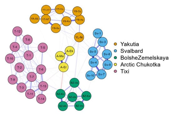 JASP network plot of diatom species composition similarity for the small Arctic lakes, p< 0.5. Tiksi (T), species from the Tiksi region 14 lakes [18]. Arctic Chukotka, species from Amguema basin lakes: Ervynaygytgyn, Matachingagytgyn, Ekitiki [7,8]. Bolshezemelskaya Tundra lakes (BZ) Vanutkiny, Kharbeyskiye, Korotaikha, Vorkuta, Usa, Kara [2]. Svalbard (Sv), Hornsund fiord, eight lakes [5]. Yakutia (Y), nine lakes: Aalaah, Kurelah, Sullah, Dyiere, Ynah, Nal Tungulu, Large and Small Tungulu, Abalah, Nidzhili [10].