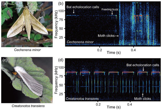 Examples of echolocation calls of Rhinolophus osgoodi and anti-bat ultrasonic clicks. (a,c) The photos of Cechenena minor and Creatonotos transiens, which are capable of producing anti-bat ultrasonic clicks. (b,d) Examples of acoustic interactions between the clicking moths and echolocating bats. (b) C. minor emitted anti-bat clicks immediately after the end of the bat feeding buzz. (d) C. transiens emitted clicks before the emergence of the bat feeding buzzes.