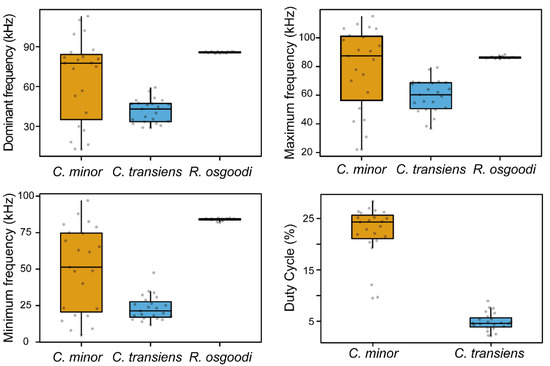 Box plots of the acoustic parameters of moth ultrasonic clicks and bat echolocation calls. Graph shows the data as jittered dots. Each dot represents the value for one click/call sequence. The number of samples per condition is: C. minor = 23, C. transiens = 23, R. osgoodi = 15. The box indicates the interquartile range (IQR), the whiskers show the range of values that are within 1.5 × IQR, and a horizontal line indicates the median.